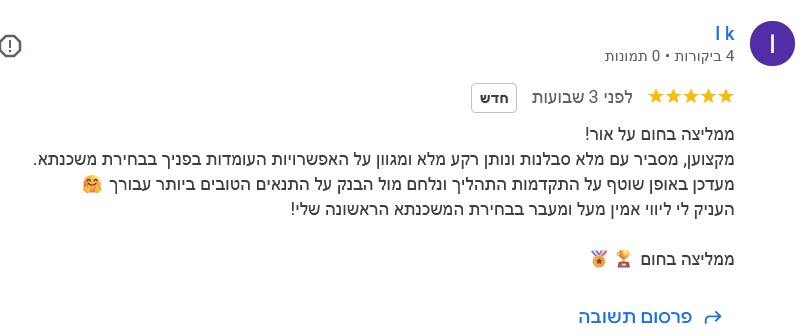 הבנק רוצה להיות בטוח שאתם "סיכון נמוך". לכן חשוב להציג תזרים מזומנים יציב, חיסכון משמעותי, היסטורית אשראי תקינה, מקום עבודה יציב. אנחנו נעזור לכם להציג את עצמכם באור הכי חיובי, תוך שמירה על כנות מלאה.